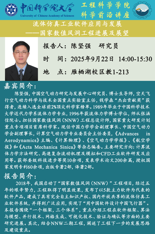 陈坚强,中国空气动力研究与发展中心研究员、博士生导师,空天飞行空气动力科学与技术全国重点实验室主任,钱学森“杰出贡献奖”获得者,连续入选全球前 2%顶尖科学家榜单。1989 年毕业于中国科学技术大学近代力学系流体力学专业,1996 年获流体力学博士学位,师从张涵信院士。担任国家数值风洞(NNW)工程总设计师,国家重大研发计划重点专项项目首席科学家。现任中国力学学会副理事长、中国空气动力学会副理事长,计算空气动力学专业委员会主任委员,《Advances in Aerodynamics》主编、《计算物理》、《空气动力学学报》、《航空学报》和《Acta Mechanica Sinica》等杂志编委。主要研究方向:计算流体力学方法研究、高速复杂流动机理及模拟和 CFD 工业软件研发及应用等。获部委级科技进步等奖 10 余项,发表学术论文 200 余篇,授权国家发明专利 60 余项,出版专著 2 部,译著 2部。