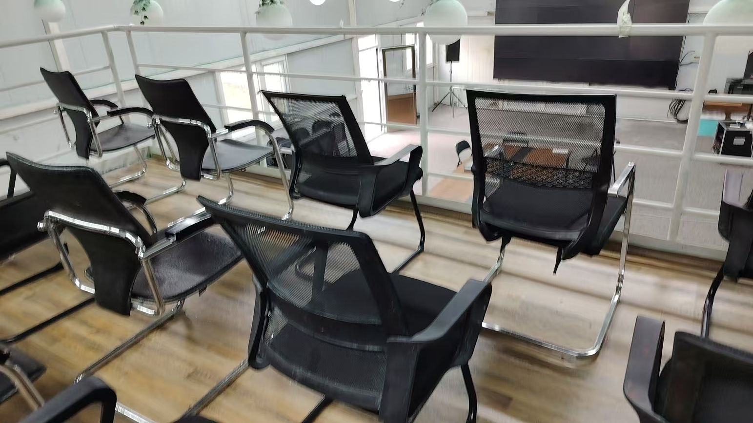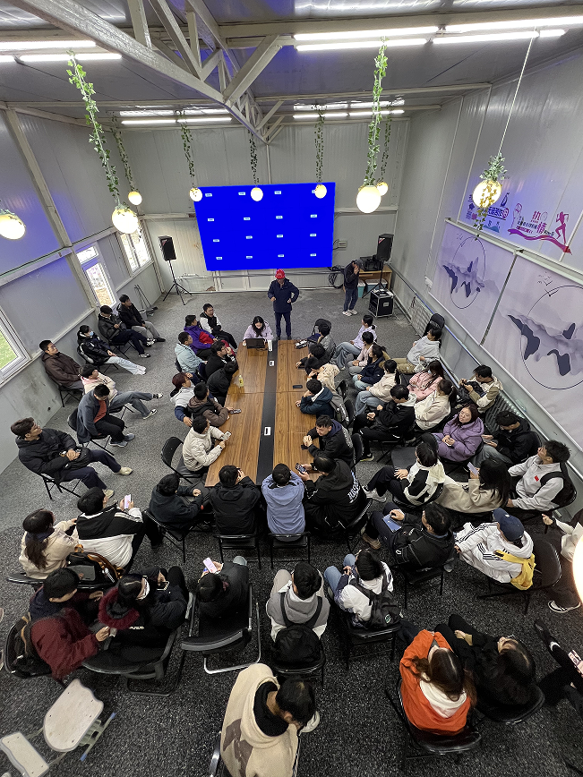 在电站上实习课,必须考虑天气的不确定性,预备上课和交流的大教室是必要的。由于上课的学生人数多,预备的电站教室像电影院一样做空间设计,分为地面层和空中层,一层的地面教室准备了大幅面投影屏幕和长条的会议桌,教室内座椅充裕,二层的教室空间装备安全围栏和几排座椅,备用。